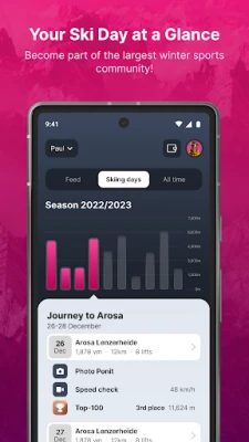 Följ dina framsteg med precision; Skiline loggar dina vertikala meter, nerförsåkt distans och antalet liftfärder, så att du alltid har full koll på dina prestationer. Men det är inte bara siffror – återupplev dina äventyr med spännande actionvideor, fånga dina snabbaste stunder med hastighetsfoton och samla minnesvärda souvenirbilder från appens fotopunkter. Varje sväng, varje hopp, varje skratt – allt finns samlat i Skiline, redo att delas och beundras.